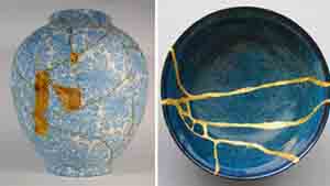 Qua thời gian, sành sứ rạn nứt và bể vỡ. Người Nhật biến những mảnh bát đĩa vỡ thành những tác phẩm đắt tiền là một trong những điểm độc đáo và đáng chú ý của nghệ thuật gốm sứ Nhật Bản. Sử dụng phương pháp Kintsugi (hay Kintsukuroi, nghĩa là “hàn gắn bằng vàng”) đã tồn tại hàng thế kỷ. Các nghệ nhân kết hợp các mảnh vỡ của gốm sứ bằng một loại sơn đặc biệt kết hợp với vàng, bạc hoặc bạch kim. Những đường nối lấp lánh ánh vàng không chỉ làm cho những chiếc bát, đĩa hư hỏng trở nên độc đáo hơn, mà còn mang lại cho chúng một cuộc sống mới. Vết rạn nứt không bị giấu đi hoặc loại bỏ mà được tôn vinh một cách đặc biệt. Một chiếc bát, đĩa được phục hồi bằng phương pháp này có thể có giá cao, tùy thuộc vào độ phức tạp và giá trị của sản phẩm ban đầu.