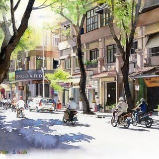 Những chiếc xe máy chầm chậm qua phố, những cửa hiệu vừa mở cửa, ánh nắng vàng len lỏi qua đám lá xanh… Yên bình...